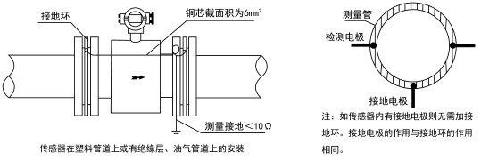 | 接地法蘭(或接地環(huán)) | 適用于非導(dǎo)體管道,如塑料管道、有襯里的管道,但有接地電極的傳感器不需要,為降低成本和使用效果,國內(nèi)電磁流量計(jì)廠家一般用增加一個(gè)接地電極代替接地環(huán)。 |